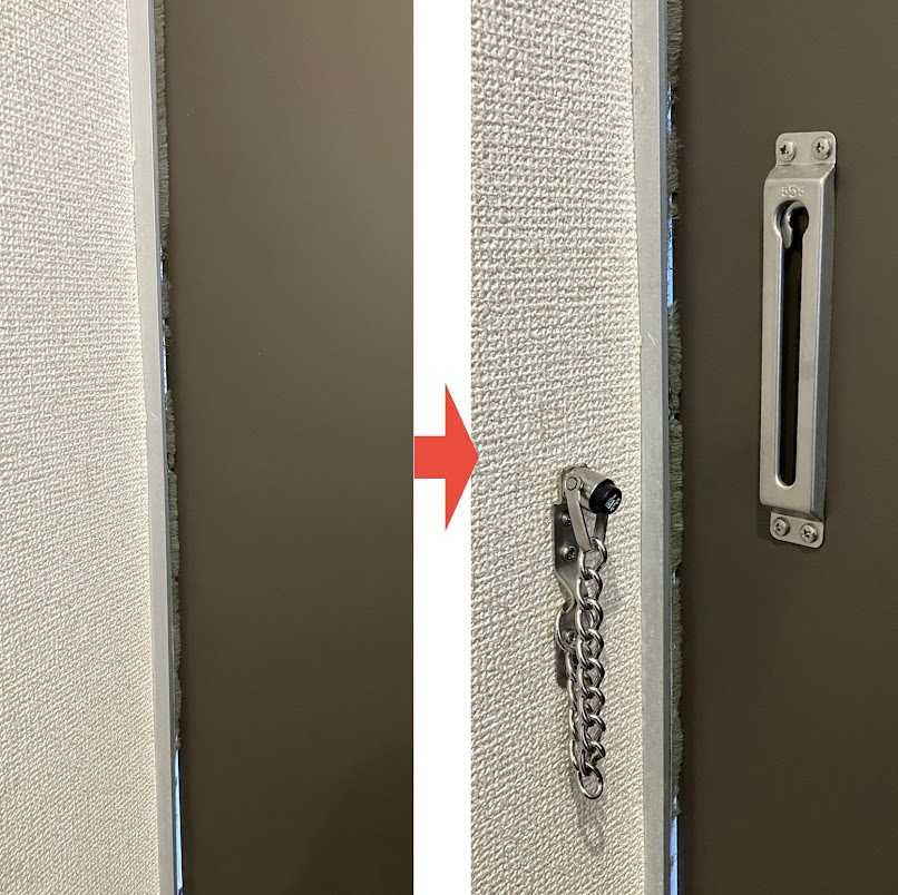 ドアチェーンとはドアの内側に付いているチェーンで訪問者の確認等を一時的に行う金具です。